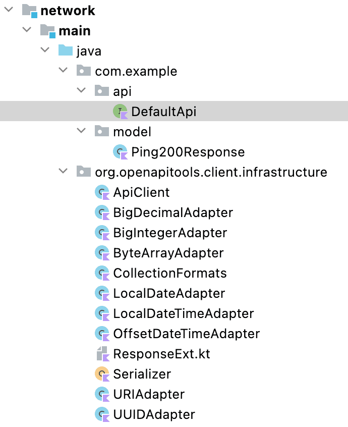 ./gradlew openApiGenerate위 명령어를 통해 network 모듈이 생성됩니다. 아래와 같은 코드가 생성되었습니다.
